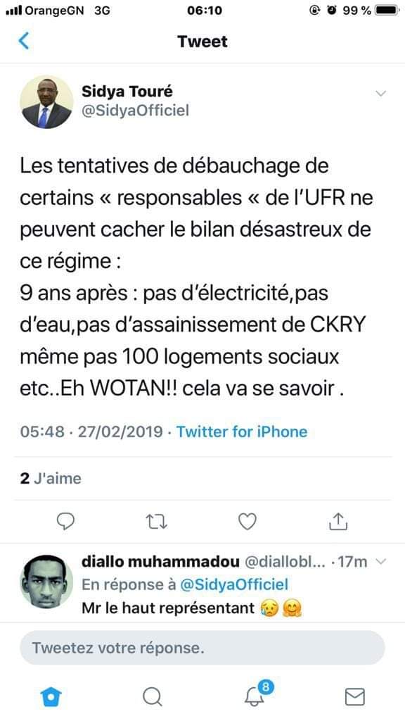 9 ans après : pas d’électricité, pas d’eau, pas d’assainissement de conakry même pas 100 logements sociaux etc… Eh wotan cela va se savoir” réagit sidya Touré président de l’UFR sur Twitter